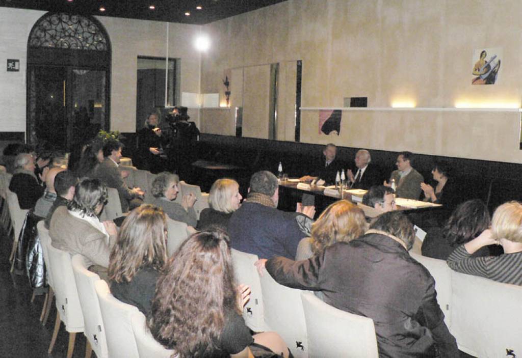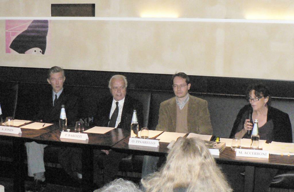 Paolo Barozzi, intervistato da Accerboni, ha raccontato diffusamente una sequenza di episodi, noti, meno noti e inediti riguardanti la famosa collezionista americana Peggy Guggenheim, la figlia Pegeen e il fantastico entourage di artisti, intellettuali e scrittori che frequentavano il suo salotto e la sua vita. Il pittore Ottavio Pinarello, autore e curatore del volume, ha quindi approfondito molteplici e interessanti aspetti della biografia di Barozzi, ricordando come questi, oltre all’esperienza iniziale con Peggy, si sia poi mosso autonomamente con l’apertura di proprie gallerie a Venezia e poi a Milano, ed abbia inoltre affiancato all’attività di promotore d’arte anche quella di giornalista e scrittore. Infine il critico e scrittore americano Alan Jones, autore di un importante libro dedicato al gallerista Leo Castelli, ne ha rievocato la figura, rammentando l’intensa attività del protagonista del libro nell’ambito della vita culturale italiana e internazionale.