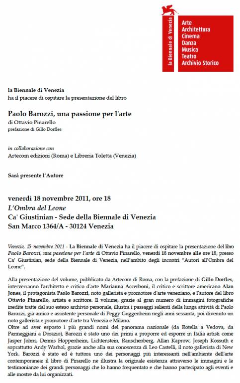 Venezia, 15 novembre 2011 - La Biennale di Venezia ha il piacere di ospitare la presentazione del libro Paolo Barozzi, una passione per l'arte di Ottavio Pinarello, venerdì 18 novembre alle ore 18, presso Ca’ Giustinian, sede della Biennale di Venezia, nell’ambito degli incontri “Autori all’Ombra del Leone”.