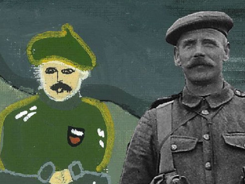 Dipinto di Nada Saoudi Mans (Bruxelles - Woluwe-St-Lambert)e foto di soldato scozzese della Grande Guerra