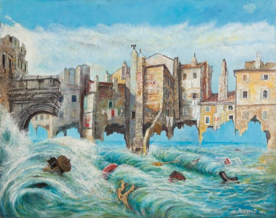 La sezione dedicata agli interni di Cittavecchia documenta i luoghi dove l’artista visse poveramente e in solitudine da bambino e che ora Bresanutti rievoca nei suoi dipinti, testimoniando anche un modo di vivere che non esiste più, come accade per altro anche nelle vedute di esterni di Cittavecchia, che narrano di un mondo scomparso. Gli interni esposti in mostra vanno da quelli dipinti agli esordi, affastellati di oggetti e di ricordi, che procurarono un’immediata notorietà al pittore, a quelli più essenziali realizzati dagli inizi degli anni 2000 in poi. Un’altra sezione è dedicata alla poetica surrealista con importanti oli realizzati tra la metà degli anni Cinquanta e gli anni Settanta e poi in una seconda fase, tra il 2000 e il 2010. Altre sezioni sono dedicate alle acqueforti, di cui Bressanutti creò negli anni Ottanta e Novanta più di 1500 pezzi, alle nature morte, ai piatti in ceramica eseguiti in tiratura limitata e numerati e alle foto d’epoca, che raccontano la vita dell’artista