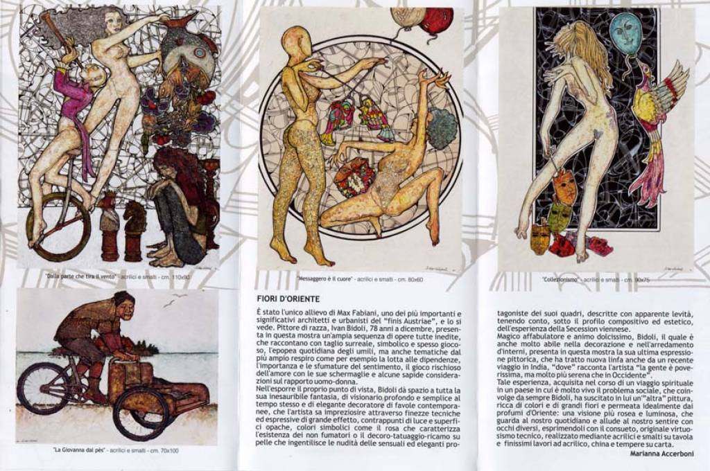 È stato l’unico allievo di Max Fabiani, uno dei più importanti e significativi architetti e urbanisti del “finis Austriae”, e lo si vede. Pittore di razza - scrive Accerboni - Ivan Bidoli, 78 anni a dicembre, presenta in questa mostra un’ampia sequenza di opere tutte inedite, che raccontano con taglio surreale, simbolico e spesso giocoso, l’epopea quotidiana degli umili, ma anche tematiche dal più ampio respiro come per esempio la lotta alle dipendenze, l’importanza e le sfumature del sentimento, il gioco rischioso dell’amore con le sue schermaglie e alcune sapide considerazioni sul rapporto uomo-donna.